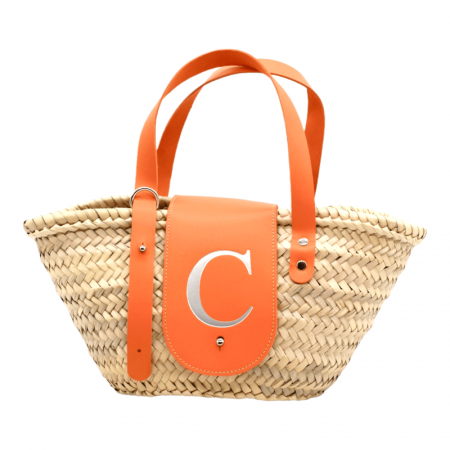 Palm basket with leather handles, measuring 19 cm in height by 33 cm in width. customized with initials in leather on the outside. the letter is embossed in gold.