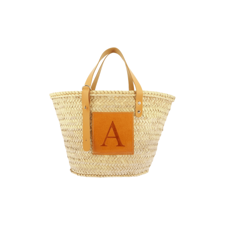 Straw basket with leather handles measuring 26 cm in height and 40 cm in width. Customized with an initial in leather on the exterior.