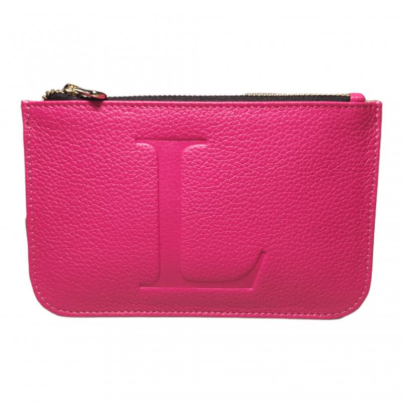 Coin purse with zipper closure and back pocket for cards.
