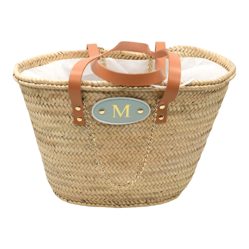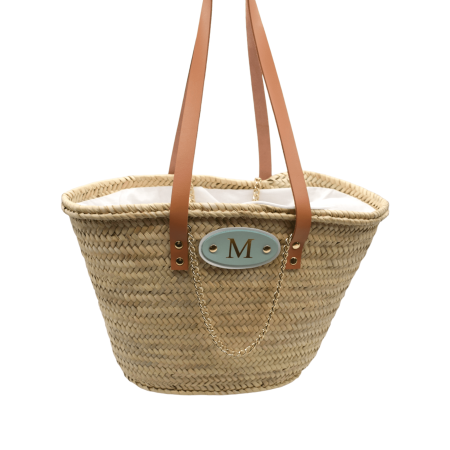 Straw basket with long leather handles and chain detail that can function as a short handle, customized with an initial engraved on the exterior. Interior drawstring closure,metal and letter engraved in gold.