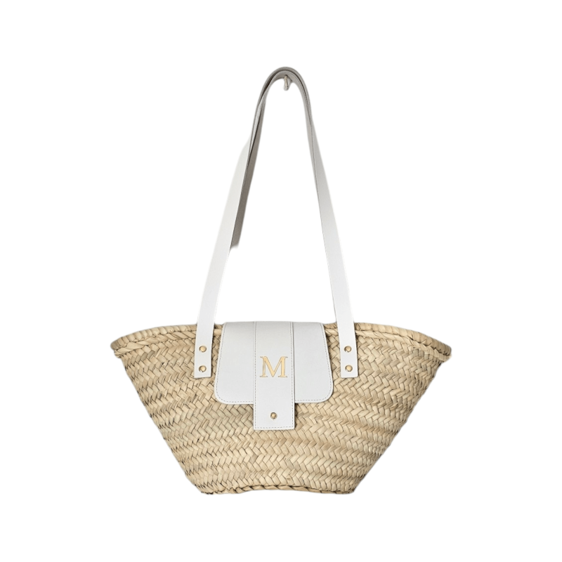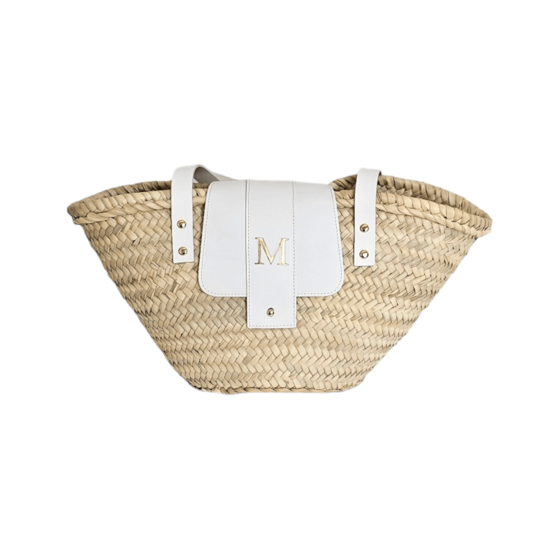 Small palm basket with long handles and personalized leather flap, measuring approximately 19 cm in height and 33 cm in width. The initial is engraved in silver (available with yellow, sky blue, iris, orange, pink, and green leather) or in gold (available with white, tan, and black leather), as shown in the photos. All measurements are approximate, as each basket is handmade, making every piece unique.
