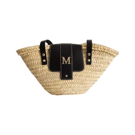 Palm basket with leather handles, measuring 19 cm in height by 33 cm in width. customized with initials in leather on the outside. the letter is embossed in gold.