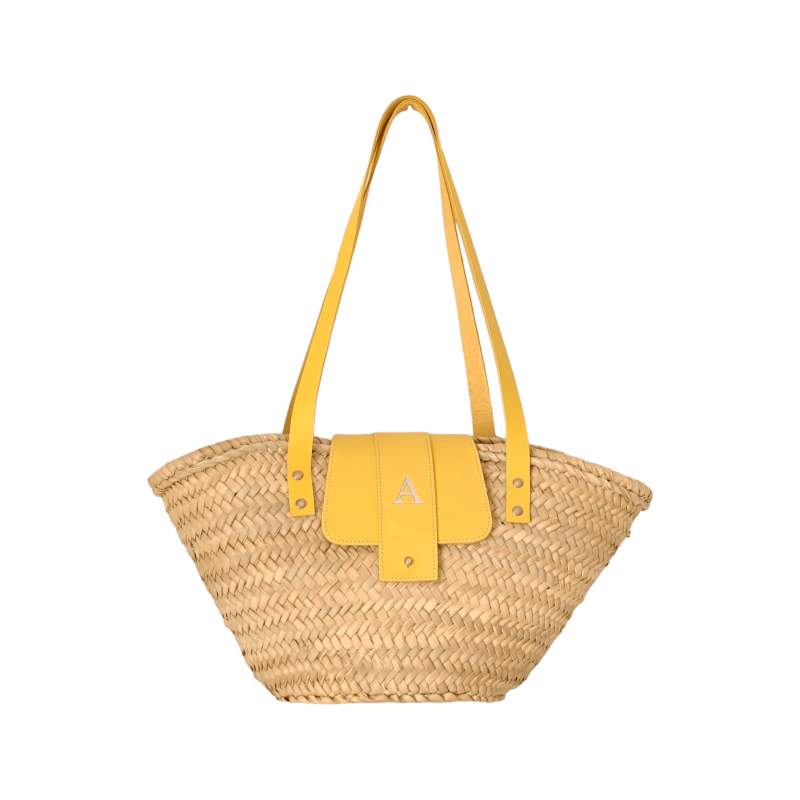 Small palm basket with long handles and personalized leather flap, measuring approximately 19 cm in height and 33 cm in width. The initial is engraved in silver (available with yellow, sky blue, iris, orange, pink, and green leather) or in gold (available with white, tan, and black leather), as shown in the photos. All measurements are approximate, as each basket is handmade, making every piece unique.