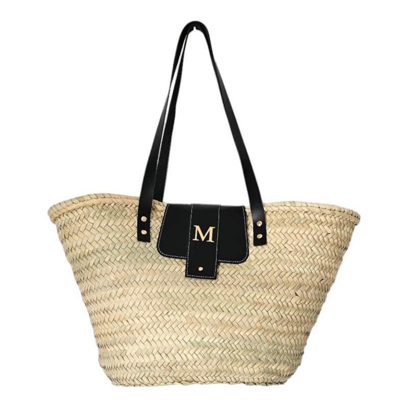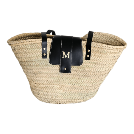 Palm basket with leather handles, measuring 19 cm in height by 33 cm in width. customized with initials in leather on the outside. the letter is embossed in gold.