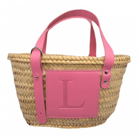 Small straw basket with adjustable leather handles, measuring 19 cm in height by 33 cm in width. Customized with a leather initial on the exterior.