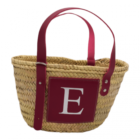 Small straw basket with adjustable leather handles, measuring 19 cm in height by 33 cm in width. Customized with a leather initial on the exterior.